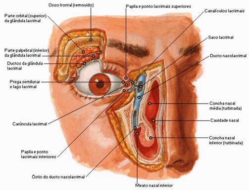 Seguindo esse caminho, as lágrimas são drenadas, de forma mais ou menos contínua, para o nariz. Ocorrendo um bloqueio em qualquer nível desse sistema, as lágrimas (até mesmo sendo a secreção normal) escorrem pela face. Os pontos e os canais lacrimais são revestidos por epitélio pavimentoso estratificado não quarantinizado.