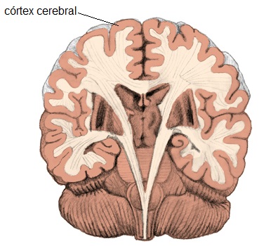 O córtex cerebral apresenta coloração cinzenta e localiza-se na área externa do cérebro. É formado por células nervosas e neurônios e é responsável pelo dom da comunicação, sentimentos, assimilação, concentração e memória.