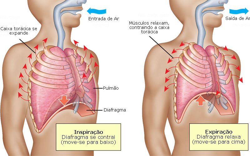 No sistema respiratório, a penetração de ar nos pulmões é consequência do aumento de volume do tórax. A caixa torácica é formada pelas costelas, o esterno, os músculos intercostais e urna lâmina musculotendinosa (o diafragma) que a limita pela parte inferior.
